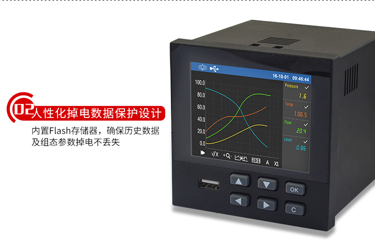 掉电保护:所有数据保存在FLASH存储器中,无需后备电池,确保所有历史数据及组态参数不会因掉电而丢失