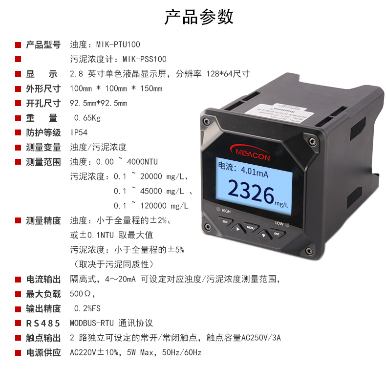 MIK-PTU100在线浊度分析仪内置微处理器,适用于于污水厂、自来水厂、水站、地表水、工业等领域浊度监测,例如:污水厂沉淀池、曝气池、氧化沟、提升泵站的浊度测量。本浊度/污泥浓度控制器是一款智能在线化学分析仪器,广泛应用于火电、化工化肥、冶金、环保、制药、生化、食品和自来水等各个行业。