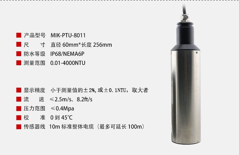 MIK-PTU100浊度/污泥浓度传感器的原理基于组合红外吸收散射光线法,应用国际浊度测定标准ISO7027方法可以连续并精确地测定浊度或污泥浓度。